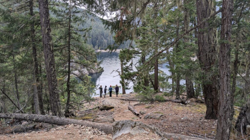 The day was calm and luminous, and the forest seemed to glow. For many in our group, this was their very first backpacking trip, and the magic of the North Cascades set the perfect stage. Around midday, we stopped for lunch near the vivid turquoise waters of Ross Lake’s Ruby Arm. Vegetable and hummus wraps never tasted so good with that view! Across the lake, steep, striated cliffs told stories of shifting water levels and deep time. Energized, we continued on, trekking another few miles through mossy woods and fern-framed switchbacks until we reached our home for the night: a group campsite beside Roland Creek, where the steady sound of flowing water welcomed us into the evening.