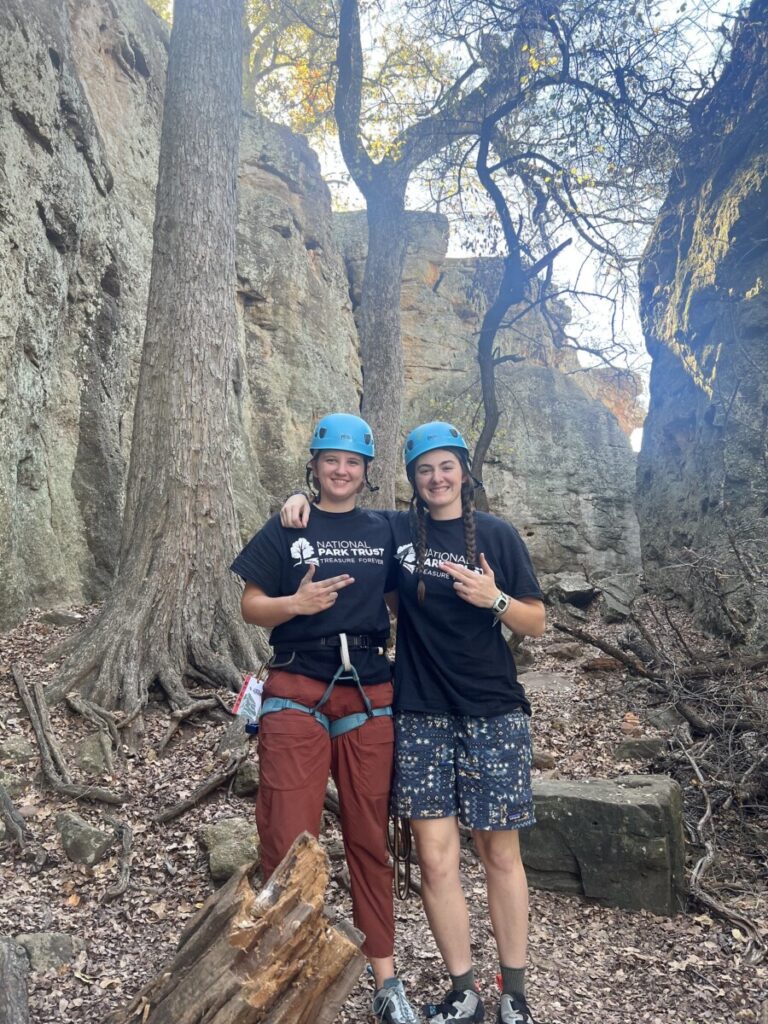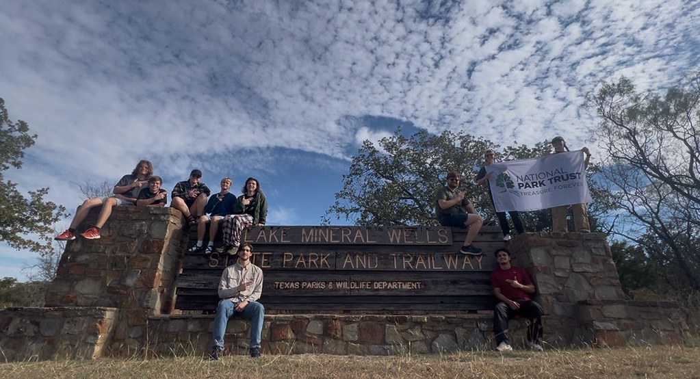 On Saturday, November 15th, we collaborated with nine members from the SFA climbing club and set off at 6 am to drive to Lake Mineral Wells State Park for their first-ever outdoor climbing experience! Our ambassadors, Ava Emerson and Maddie Sweeten, had loaded everything up the night before so that we could get on the road as soon as possible. After a long drive (with lots of bumps in the road and sleepy participants), we finally made it to the park. We quickly got out our sandwich food and ate a yummy parking lot lunch.