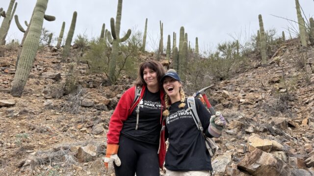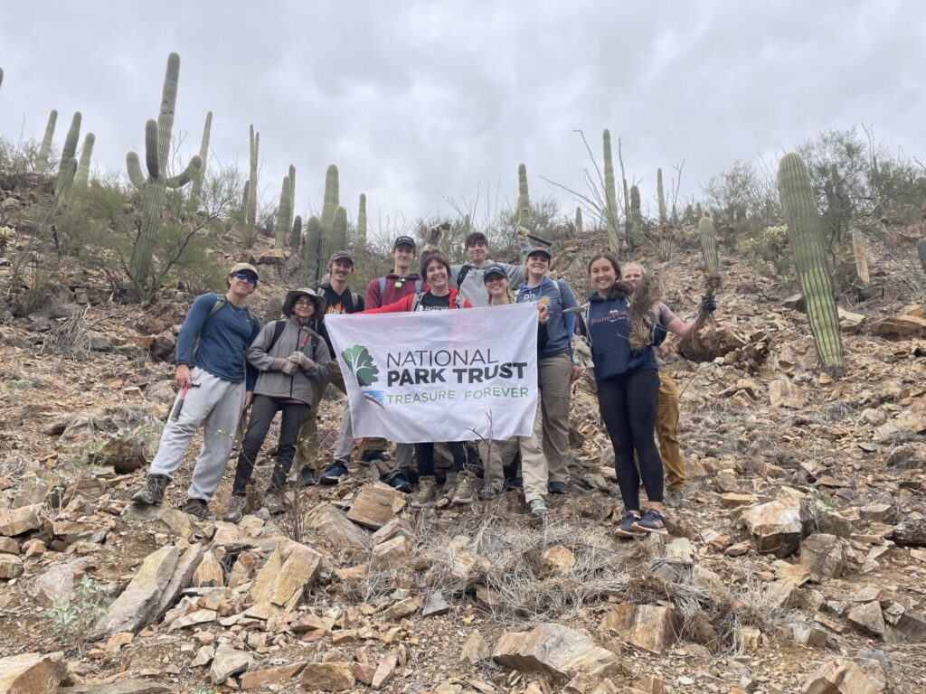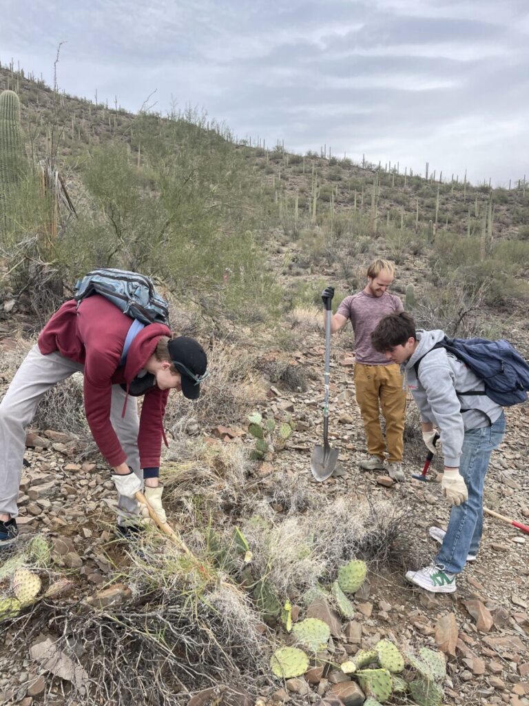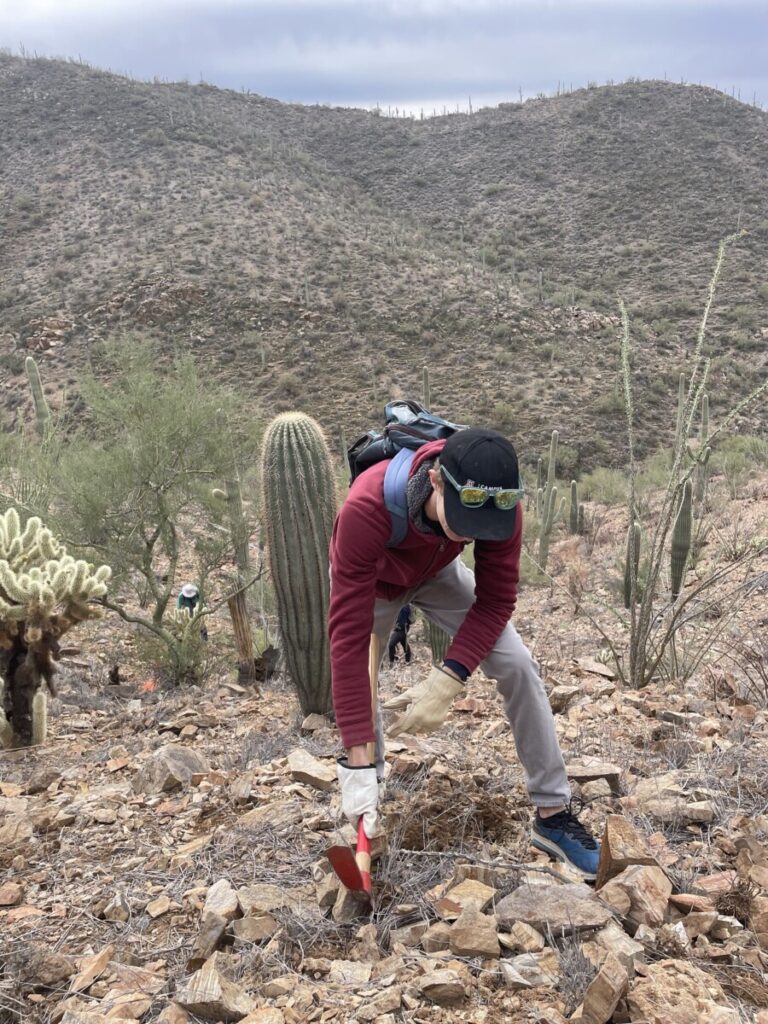 On Friday, November 21st, students from the University of Arizona ventured to the Tucson Mountain Park for the National Park Trust Stewardship Outing. Myself (Ryleigh Selby) and fellow National Park Trust Ambassador Meg Robertson drove eight students to the Arizona-Sonora Desert Museum, where we met up with Sonya Norman, a facilitator of the Sonoran Desert Weedwackers. Sonya organizes groups to remove buffelgrass, an invasive species spread across the Tucson desert. We hiked out into the desert, crossing from the Tucson Mountain Park into Saguaro National Park West, where we spent a few hours pulling the invasive species. Sonya gave a demo of how to remove buffelgrass most effectively, using a weeder hand tool to dig away the surrounding dirt and rocks, then pulling at the base of the plant to remove all the roots. We spent our time hacking away at the dirt, pulling the weeds, and piling them up to be covered with rocks, with the seeds buried away from the sun’s reach. Buffelgrass seeds can only regrow if exposed to sunlight, and regular removers of the species have observed that bagging the weeds can spread the seeds more than simply folding them under the grass and covering them with rocks.